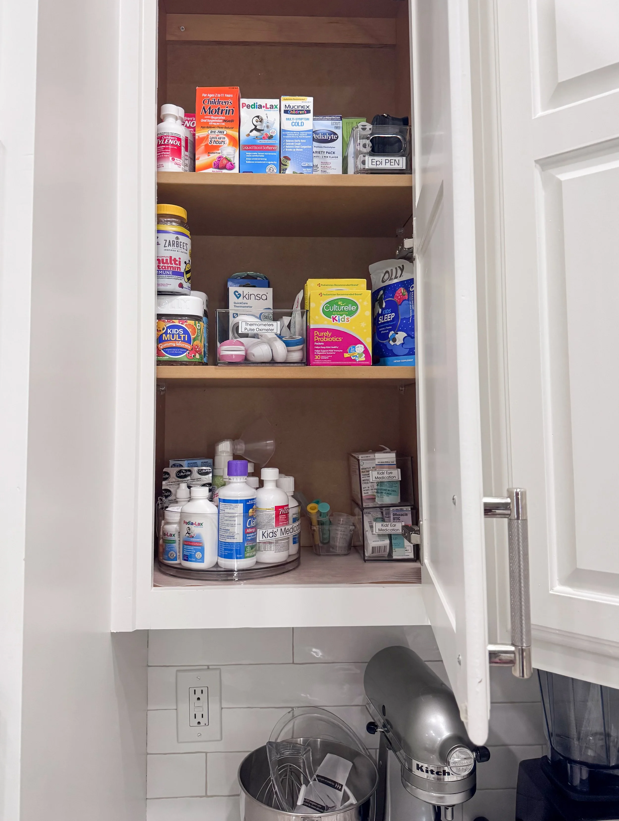 I almost always recommend a divided lazy susan for storing and organizing medications. The dividers help you keep cold medicine separated from pain relief and bandaids.